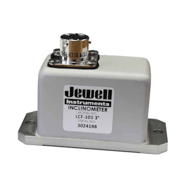 The Jewell LCF Series flexure suspension servo fluid damped inclinometer is a ±1° to ±90° device designed for applications where high levels of shock and vibration are present. LCF units are characterized by excellent turn-on repeatability and very low hysteresis. This unit is available with a pin terminal connection or a 6-pin cable connection.